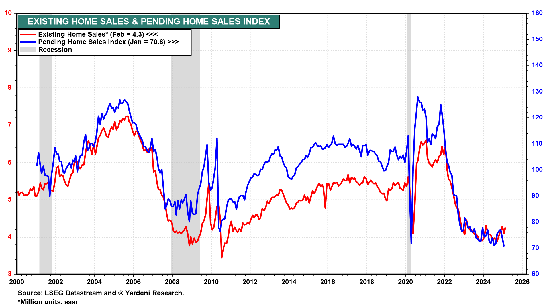 (3) Existing home sales. Existing home sales rose 4.2% (saar) in February (chart). While sales did fall 1.2% y/y, they handily beat expectations for a monthly decrease. Lower pending home sales and rising inventories suggest home sales will fall in the coming months. However, as long as Treasury yields remain around current levels, mortgage rates may be low enough for the housing market to thaw in the spring.