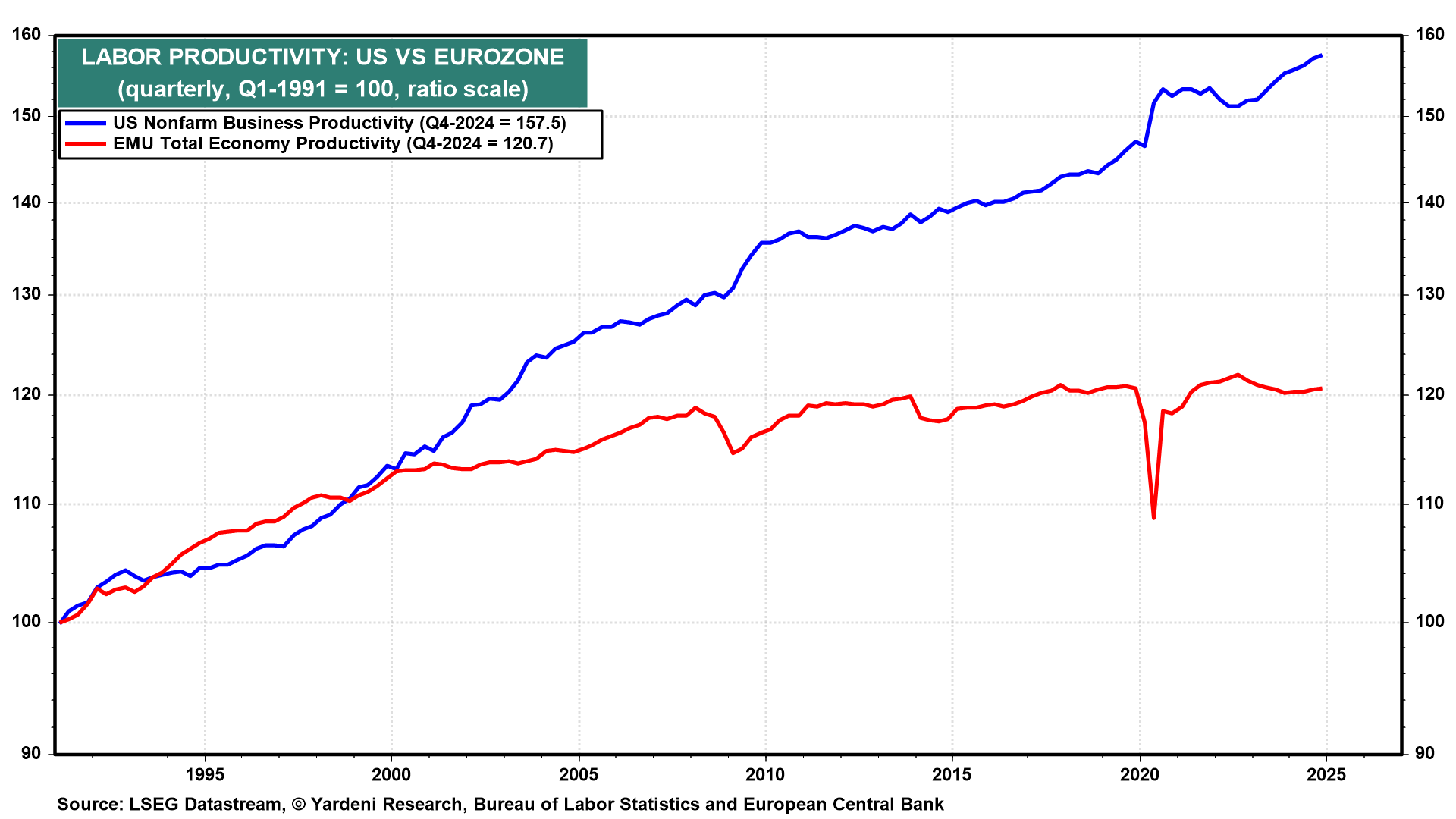 Still, the gaps in stock market multiples and sovereign bond yields in the US relative to overseas ones remain relatively wide. We expect they will remain so if US productivity growth continues to outpace productivity growth abroad, especially in Europe (chart). That’s our expectation.