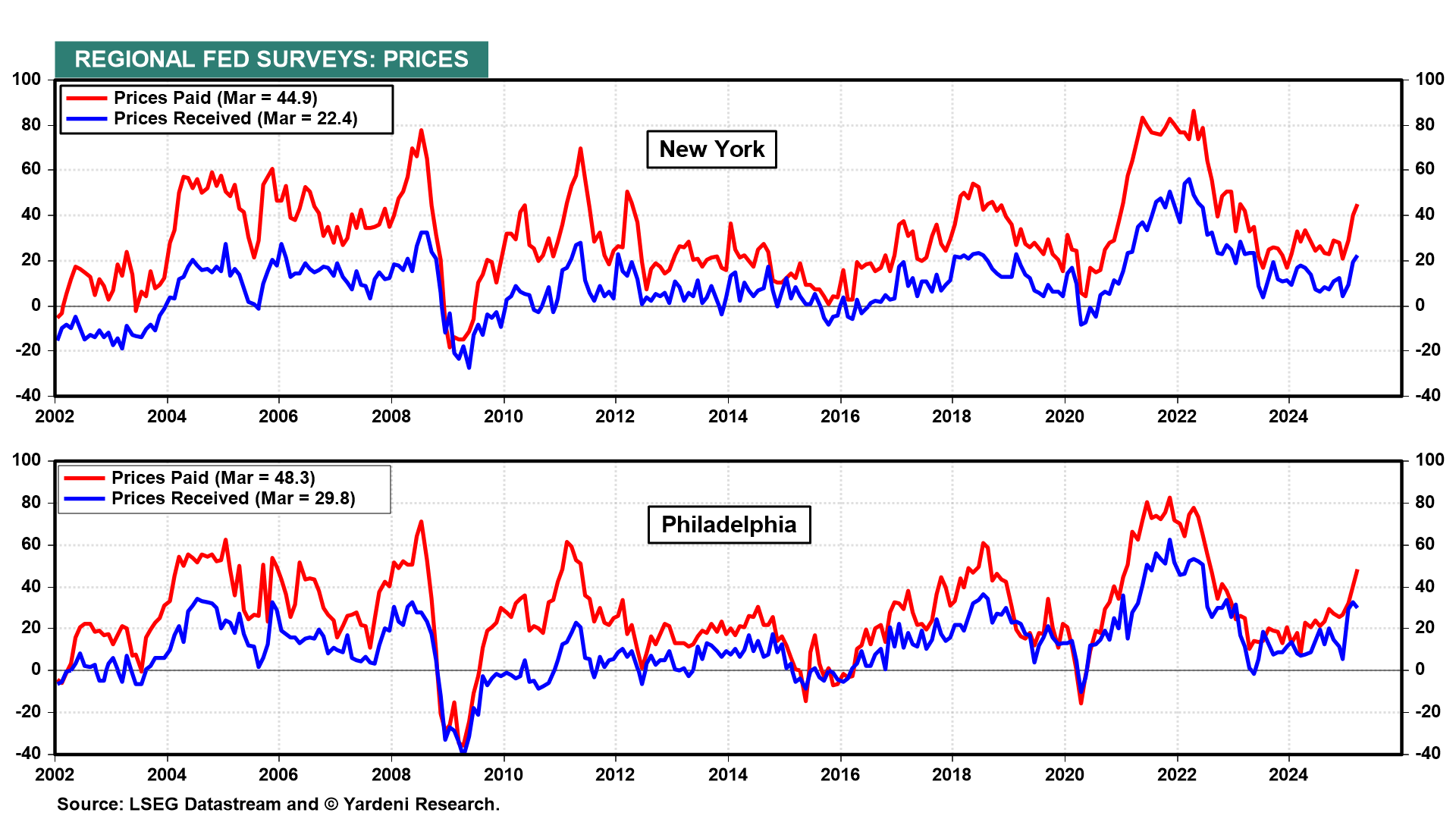 (4) Manufacturing. March's Philly Fed regional M-PMI was weaker than in February, but more upbeat than the New York Fed's March M-PMI released earlier this week. Business activity remained elevated, and employment surged. However, the prices-paid indexes in both surveys have been heating up as a result of tariff effects (chart).