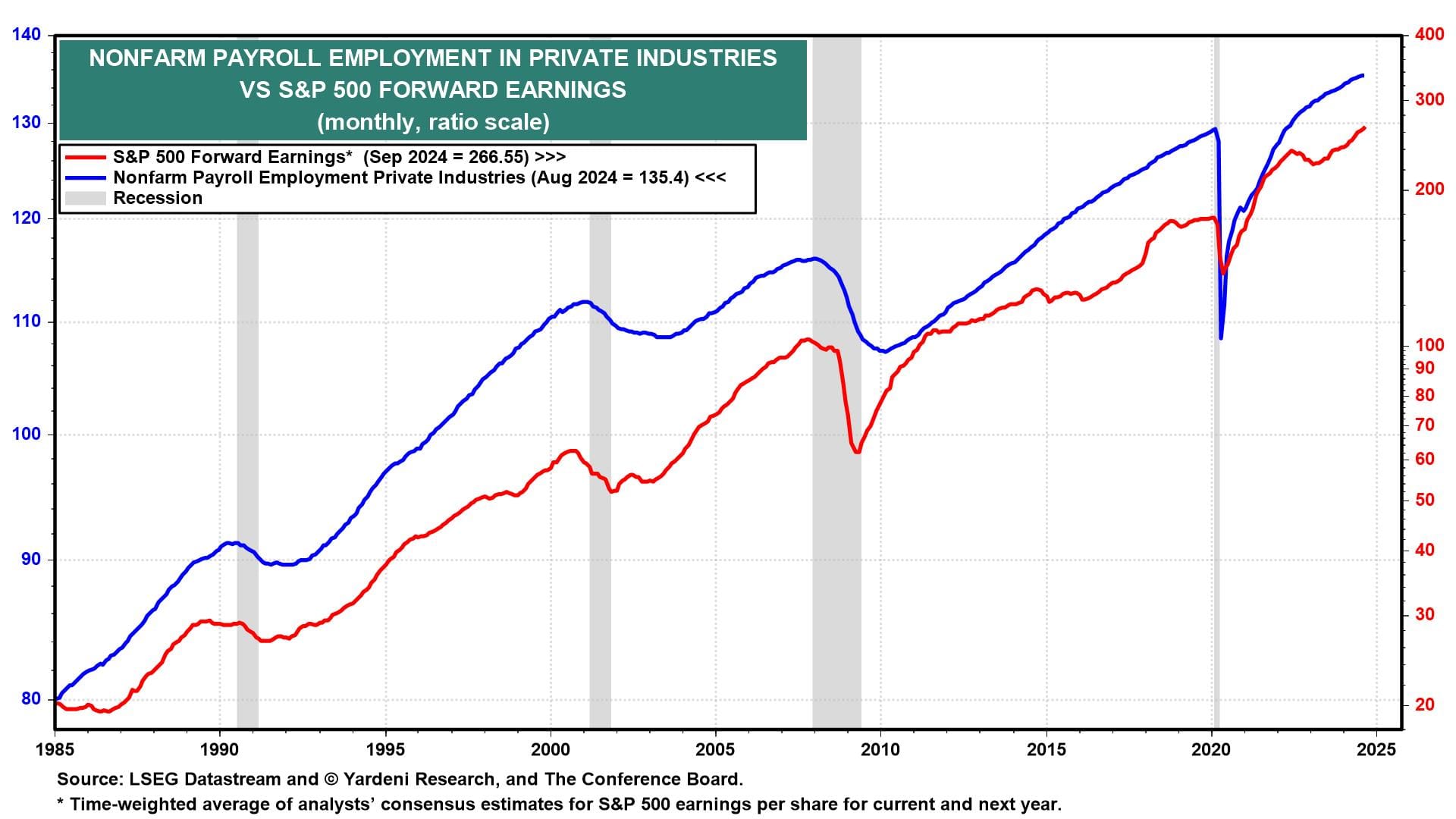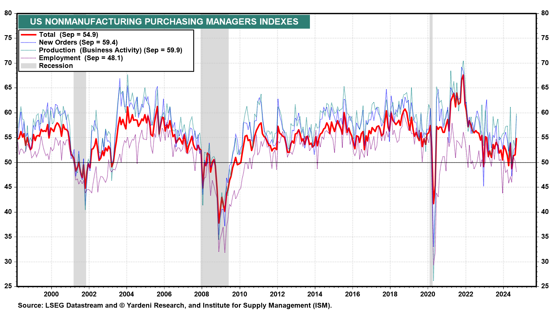 2) NM-PMI. September's ISM nonmanufacturing PMI jumped from 51.5 to 54.9, the highest reading since February 2023 (chart). The new orders and production sub-indexes both surged. The employment sub-index was relatively weak.