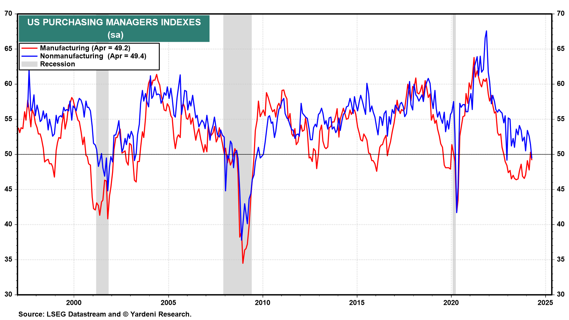 Among last week’s batch of weaker-than-expected economic indicators were April’s M-PMI and NM-PMI compiled by the Institute for Supply Management (ISM). Both fell below 50.0 during April, with the former at 49.2 and the latter 49.4 (chart). Here’s more: