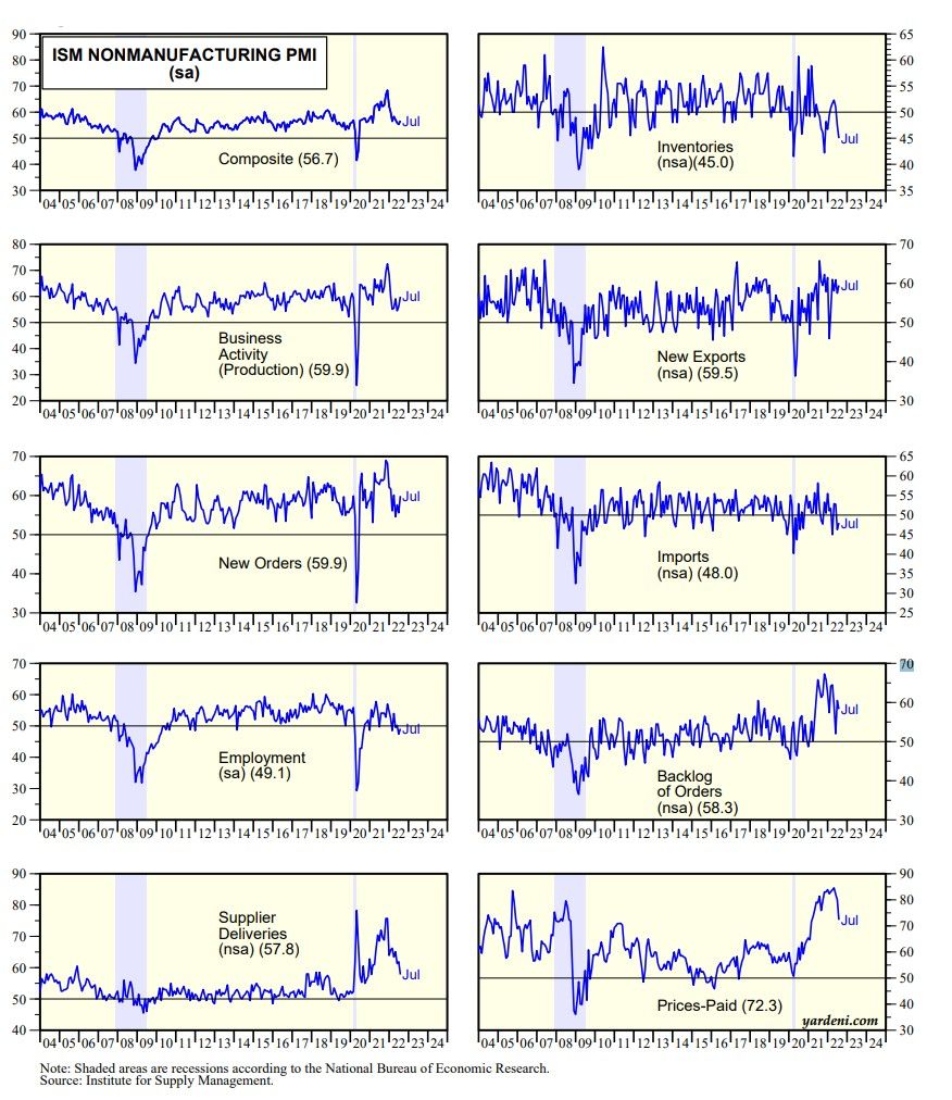 (1) The NM-PMI's new orders index was strong at 59.9. But the employment index (at 49.1) surprised on the downside, though yesterday's JOLTS report did show fewer job openings in some major services industries.