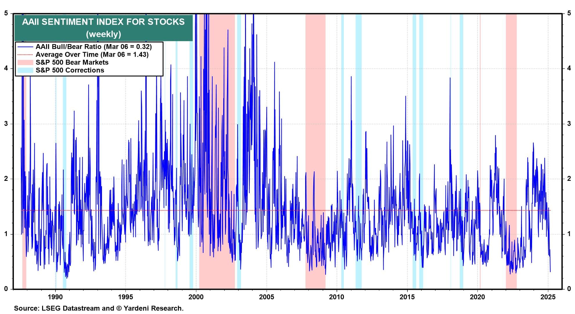 Both indexes rallied nicely on Friday and today. That action jibes with the extremely bearish sentiment readings of the bull/bear ratios compiled by Investors Intelligence and AAII. Last week, the former was down to 0.80, the lowest since the 2022 bear market, and the latter was down to 0.32, well below its average over time of 1.43 (chart). Both these ratios tend to be contrary indicators.