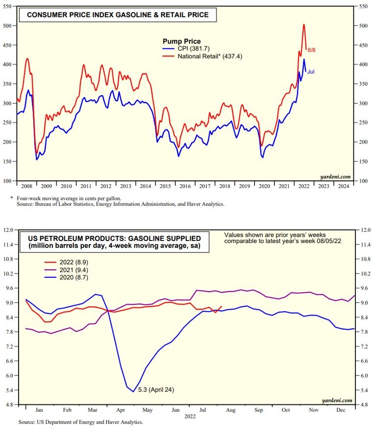 The drop in the national retail price can be attributed to consumers reducing their usage of gasoline as the summer driving season started during the first week of July, when the price peaked around $5.00 per gallon (chart below). During the August 5 week, the four-week average of usage was down 5.3% from a year ago. The four-week average price fell back down to $4.37 during the August 8 week.