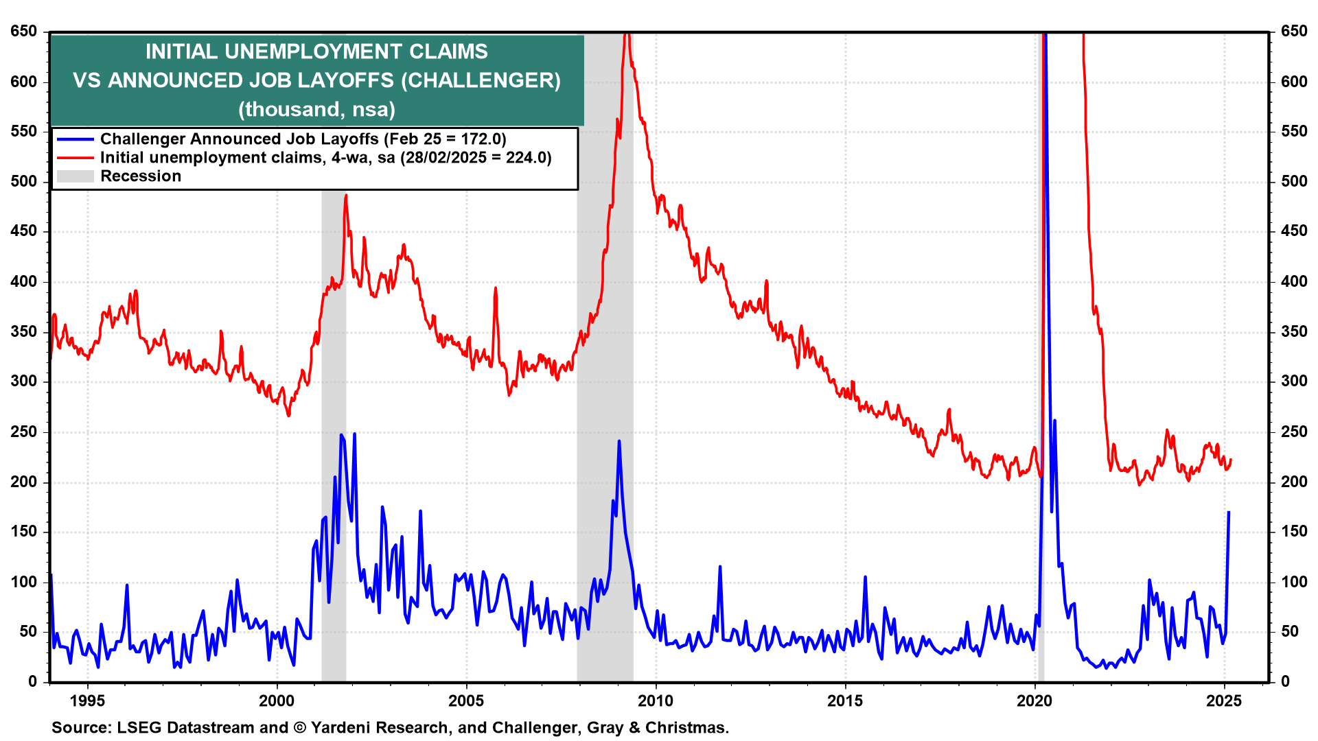 We raised the odds of a recession on March 4 from 20% to 35%. Today's Challenger Report showed an alarming jump in February's announced job layoffs to 172,017, the highest since July 2020 (chart). On the other hand, initial unemployment claims remained low through the February 28 week. So we aren't raising our odds of a recession again, for now.