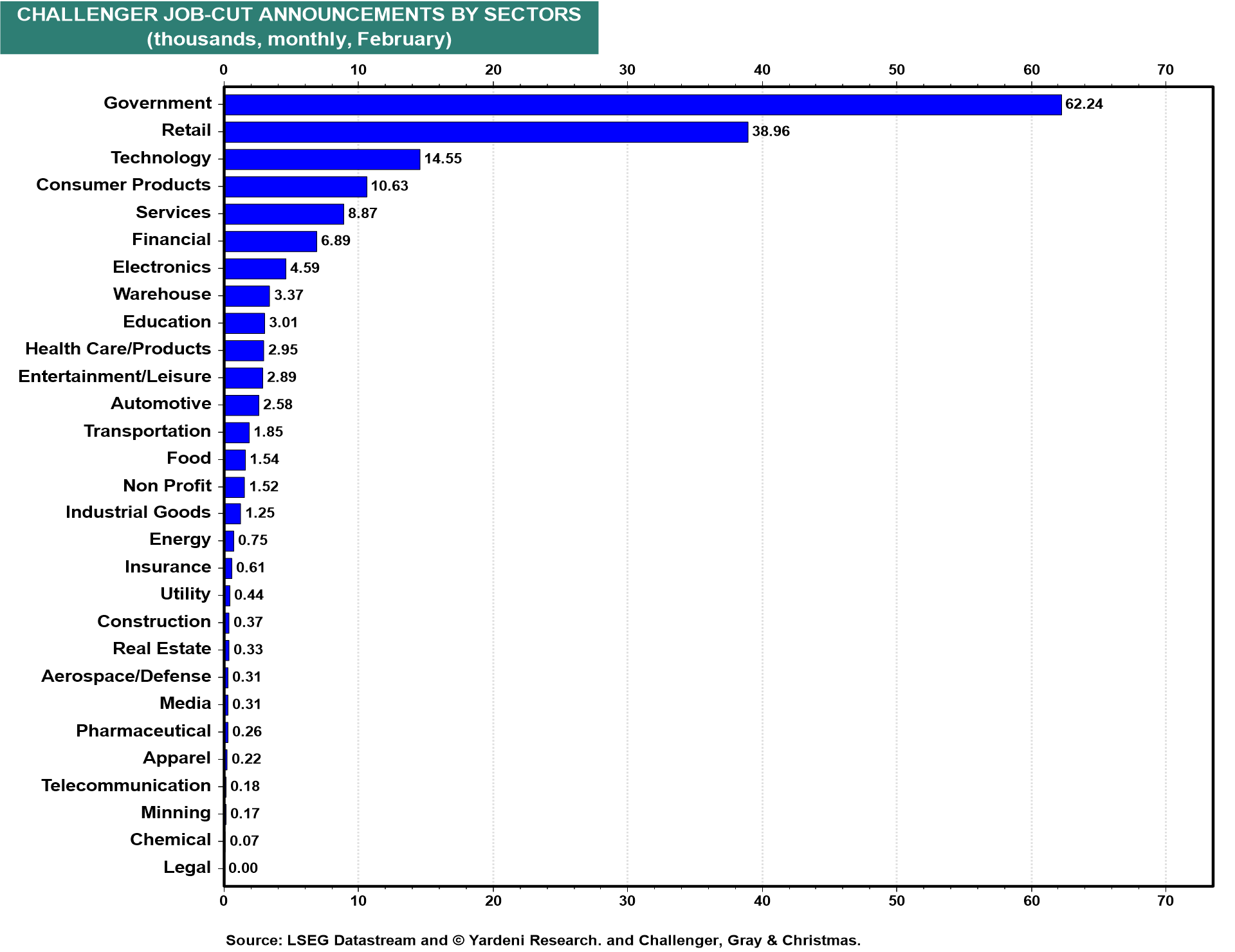 A third of February's layoffs were announced by the government sector. That's not surprising given the activities of the DOGE Boys (chart). Announced layoffs in the private sector totaled 109,777 with retailing accounting for 35% of those layoffs.