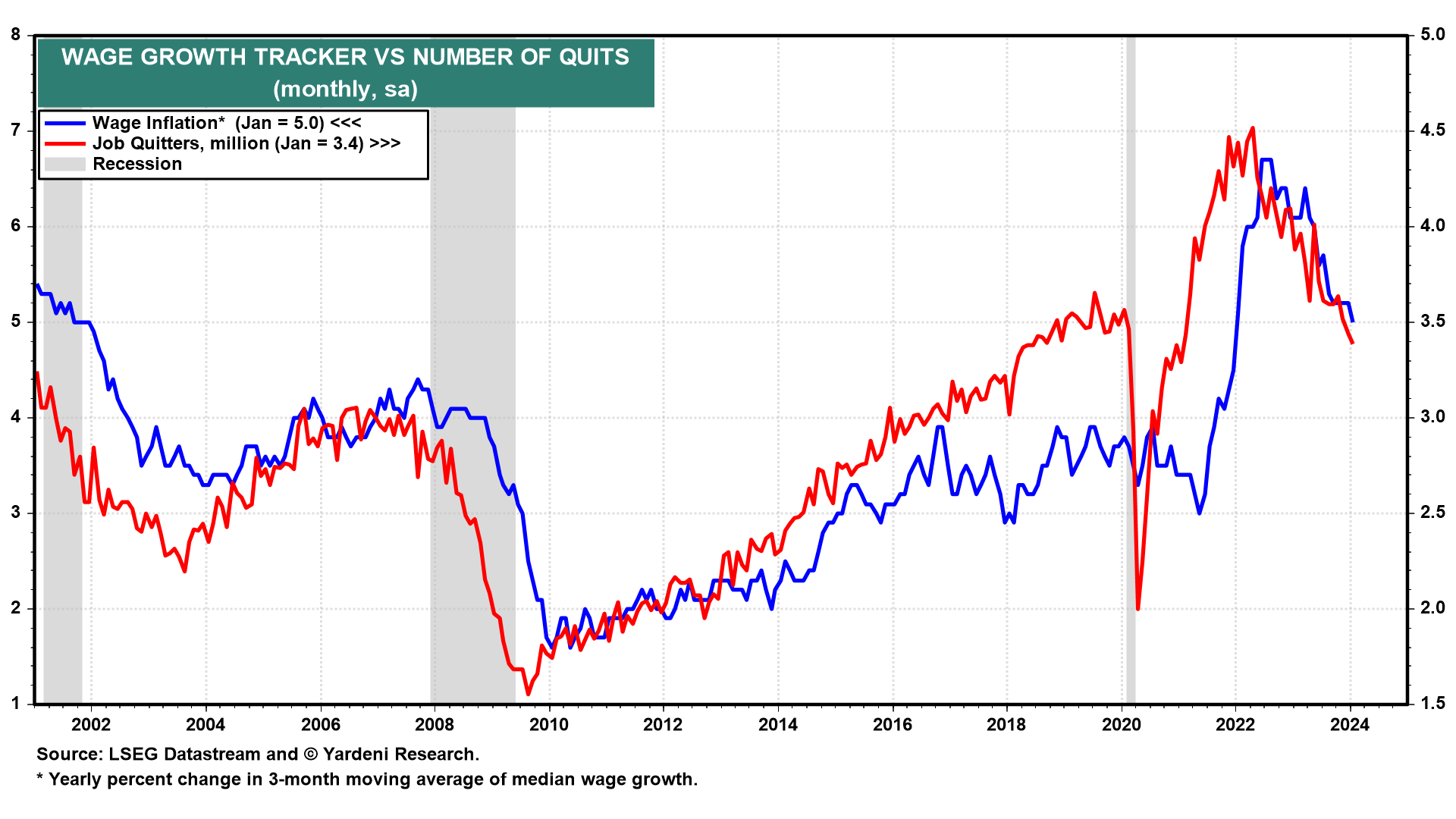 In addition, quits are falling, which should help to moderate wage inflation and boost productivity (chart). Wage inflation tends to be higher for job switchers than for job stayers.