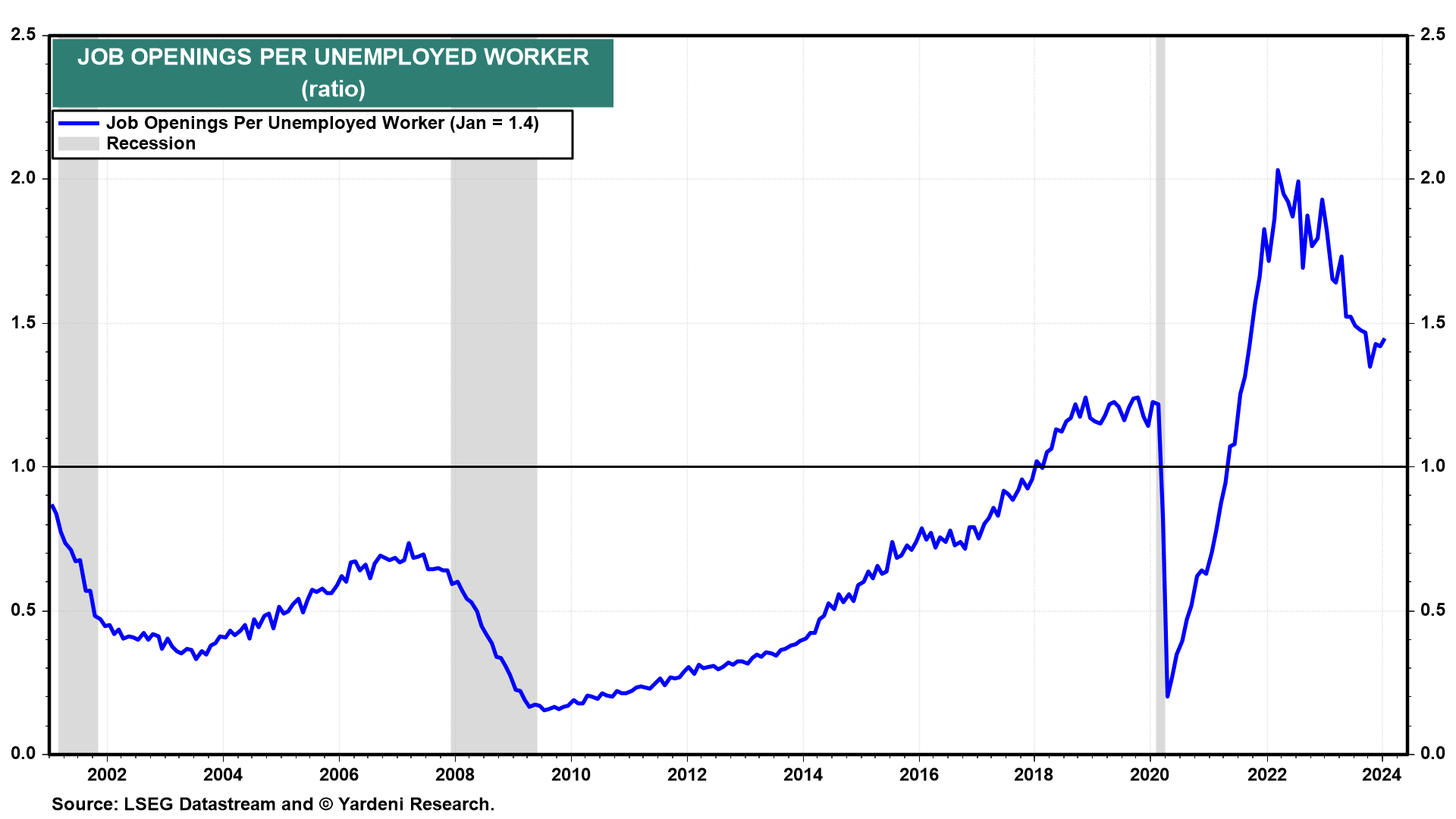Today's JOLTS report for January was happy news. There were still plenty of job openings at 8.86 million , or 1.4 openings for every unemployed worker (chart).