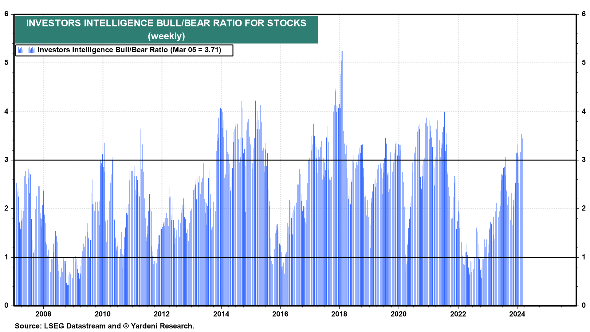 Well, Investors Intelligence Bull/Bear Ratio (BBR) rose to 3.71 this past week (chart). That's the highest since July 5, 2021. Back then, the bulls continued to stampede until January 3, 2022. Previously, our research has shown that BBR readings below 1.0 are better contrarian buy indicators than readings above 3.0 are sell contrarian signals.