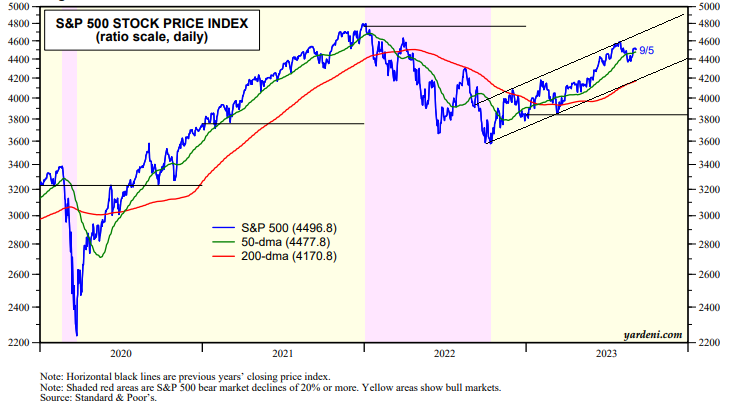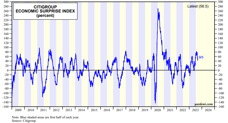 (1) Bond yield. The 10-year Treasury bond yield closed back above 4.25% today. It did so in response to rising oil prices. In addition, investors and traders are jittery about next Wednesday's CPI report for August. And, of course, there is the uncertainty about what the FOMC will decide to do on September 20. Meanwhile, the Citigroup Economic Surprise Index has been falling recently, which should be bullish for bonds, though it did edge up today (chart).