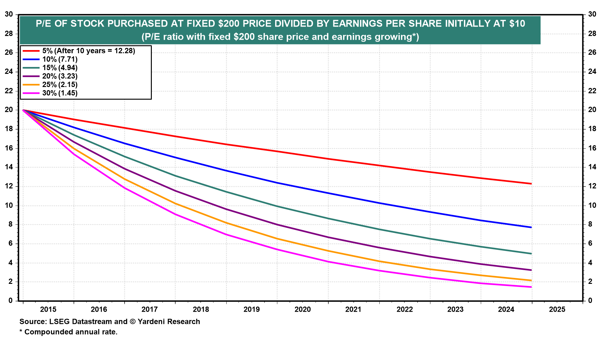 The stock market is discounting the ongoing resilience of the economy and corporate earnings. It is discounting that the odds of a recession over the rest of the Roaring 2020s are low. The longer the economy is expected to grow without a recession, the more sustainable high valuation multiples can be, since earnings growth can be expected to justify those valuations (chart).