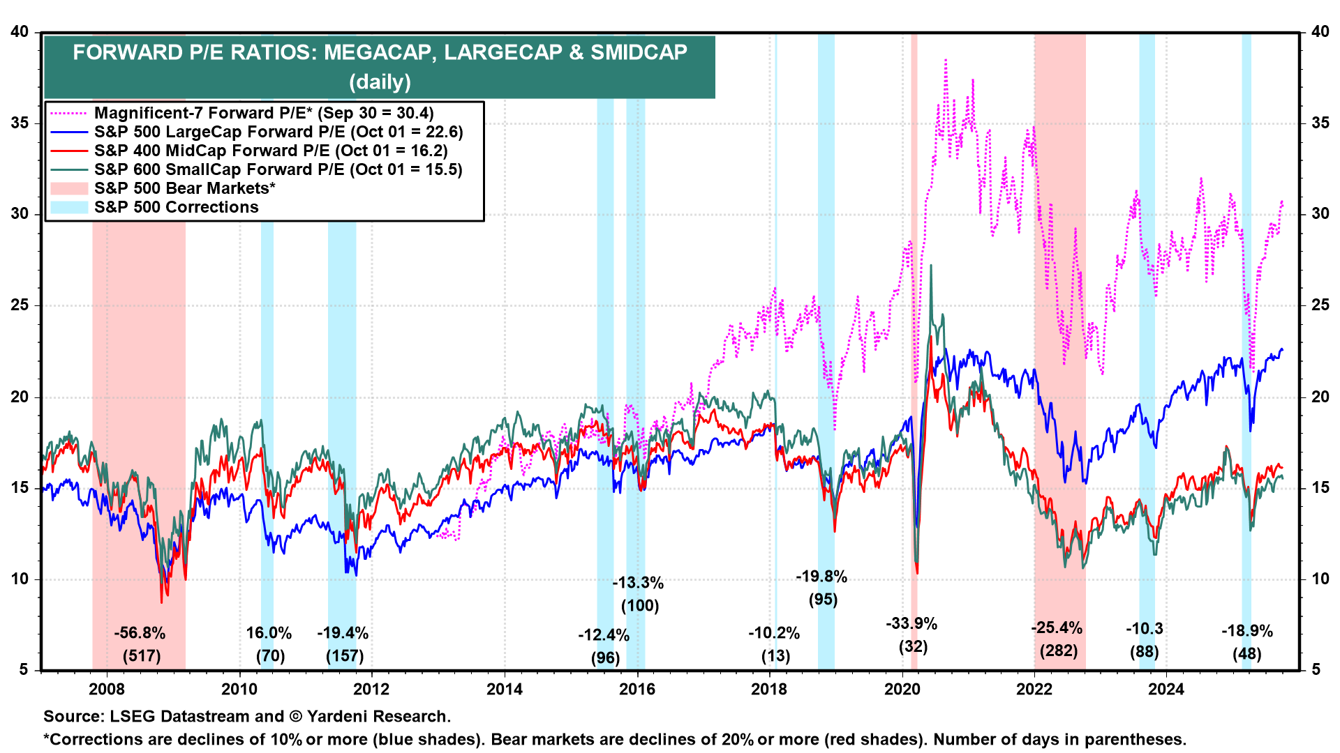 The S&P 500 experienced a correction earlier this year. Its forward P/E (i.e., the multiple using forward earnings as the “E”) fell from about 22.0 at the start of this year to 18.0 on April 8. Now it is back above 22.6. Leading the way down in the S&P 500’s correction was a sharp drop in the forward P/E of the Magnificent-7 stocks from 31.0 to 22.0. It is now back at 30.4 (chart).