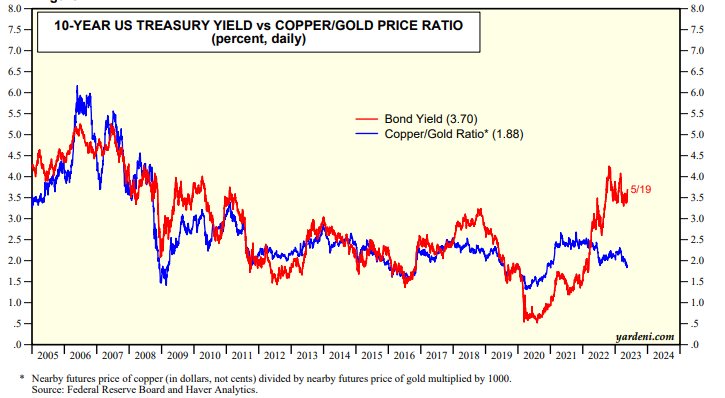 Two of our favorite technical indicators for the 10-year Treasury bond yield are currently bullish. The yield tends to be highly correlated with the ratio of the nearby futures prices of copper to gold (chart). The ratio suggests that the yield, which is currently 3.70%, should be much closer to 2.00%. We view the ratio as a risk-on versus a risk-off indicator.