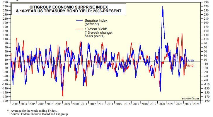The Citigroup Economic Surprise Index (CESI) is highly correlated with the 13-week change in the 10-year yield (chart). The CESI fell from a recent peak of 61.3 on March 28 to 5.5 on May 19.