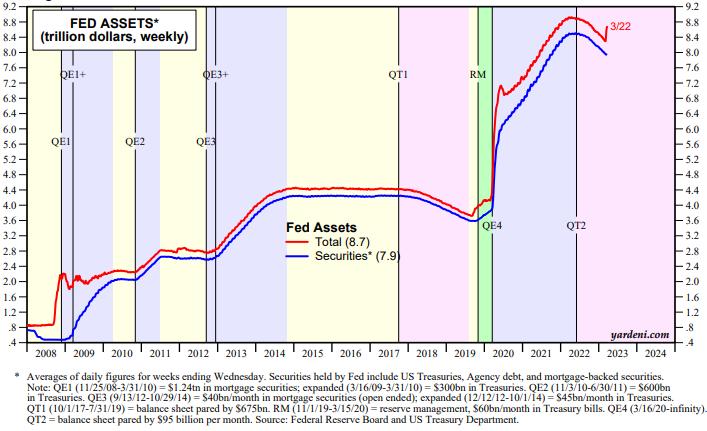 The total assets of the Fed rose from $8.4 trillion to $8.7 trillion (chart). The Fed continued with its QT program resulting in a decline of its holdings of securities by $9.8 billion to $7.9 trillion.