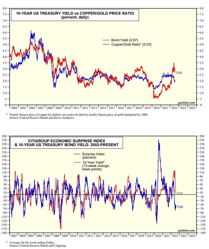 The US Treasury bond yield peaked this year (so far) at 3.49% on June 14, falling to 2.67% on Friday. That’s surprising given that inflation remains so high. But we aren’t surprised. As we’ve pointed out before, the bond yield closely tracks the copper/gold price ratio and the Citigroup Economic Surprise Index (charts below). Both remain bullish for the bond market, with the copper/gold price ratio signaling that the yield should be closer to 2.00%.