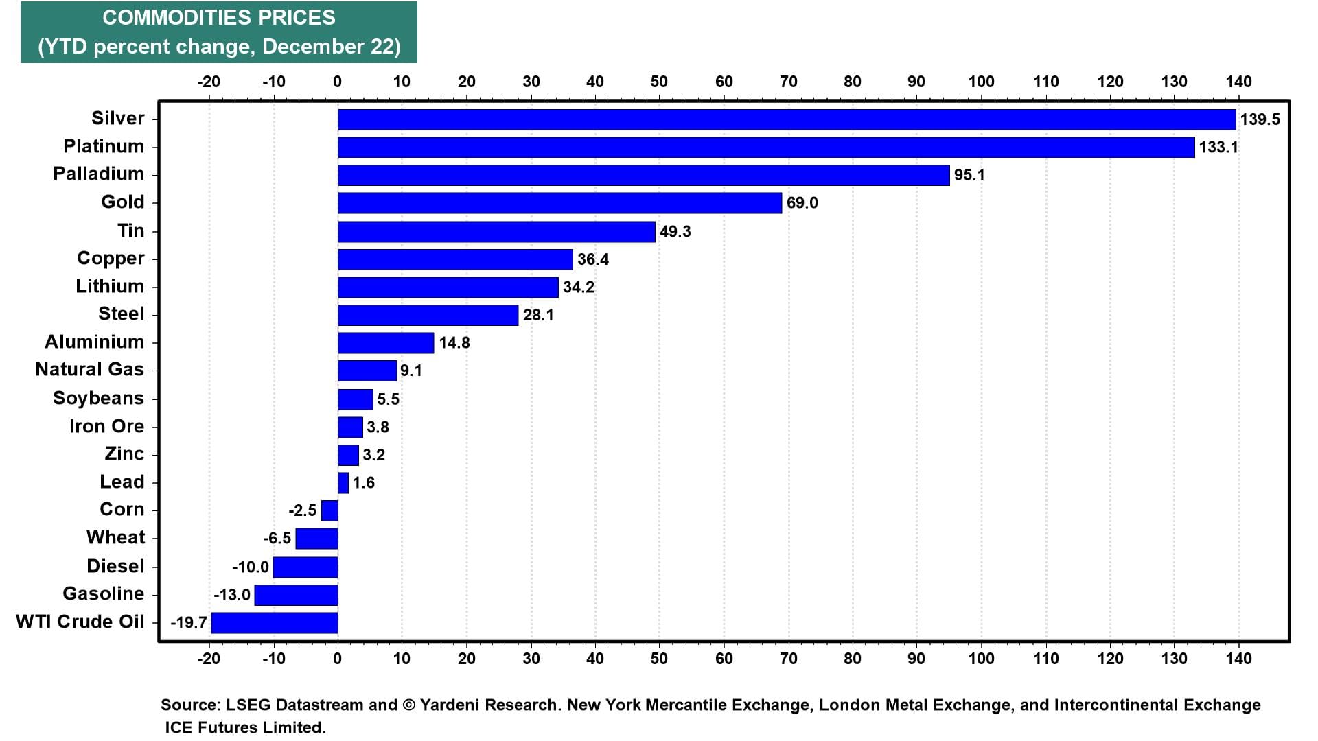 Are the soaring prices of precious metals a warning sign that the Roaring 2020s might end in 2026? We don't think so. However, we have been considering what might be driving the recent spike in precious metals prices. On a y/y basis, gold is up 69.0%. It is lagging silver (139.5%), platinum (133.1%), and palladium (95.1%). We doubt this reflects a rebound in global economic activity, as prices of basic metals, which are more closely linked to industrial production, have increased by much less (chart).