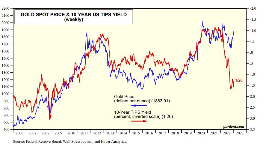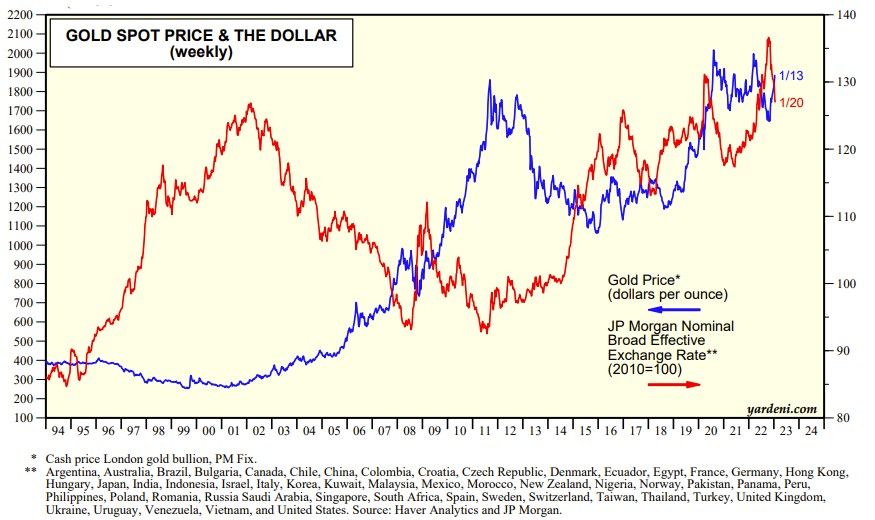 Since 2006, the gold price has also been inversely correlated with the 10-year US TIPS yield (chart). The latter soared during 2022, weighing on the price of gold. It is no longer doing so now that the TIPS yield has been slightly weakening since late last year.