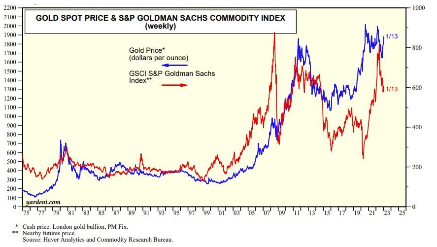 Gold is a commodity priced in dollars. Like other commodities priced in dollars, the gold price is inversely correlated with the trade-weighted dollar (chart). The former has been rebounding since late last year as the dollar has been weakening on expectations that the Fed is almost done raising interest rates.