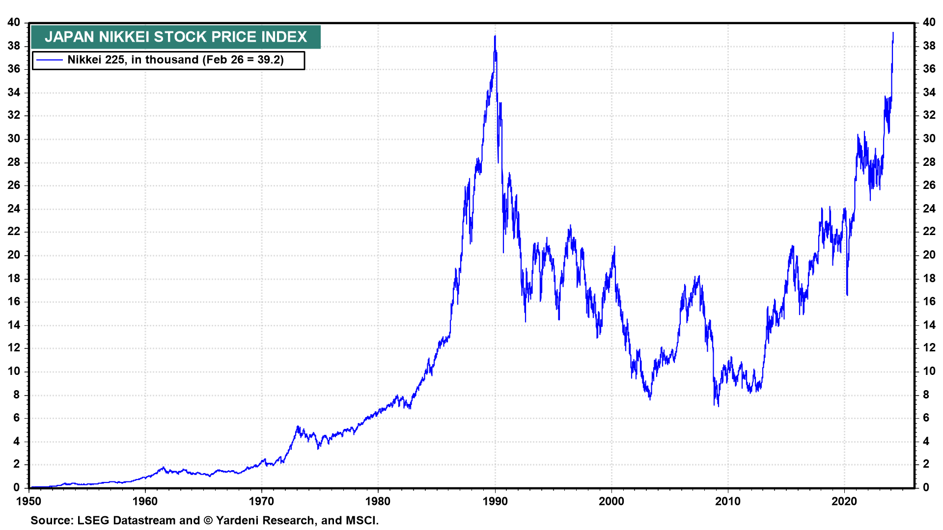 Japan's Nikkei stock price index just rose to a new record high. It's been a long time coming given that the previous record high occurred on January 3, 1990 (chart). Perversely, the new high coincides with Japan falling into a recession during the second half of last year. If the economy is weak, why is the stock market so strong?