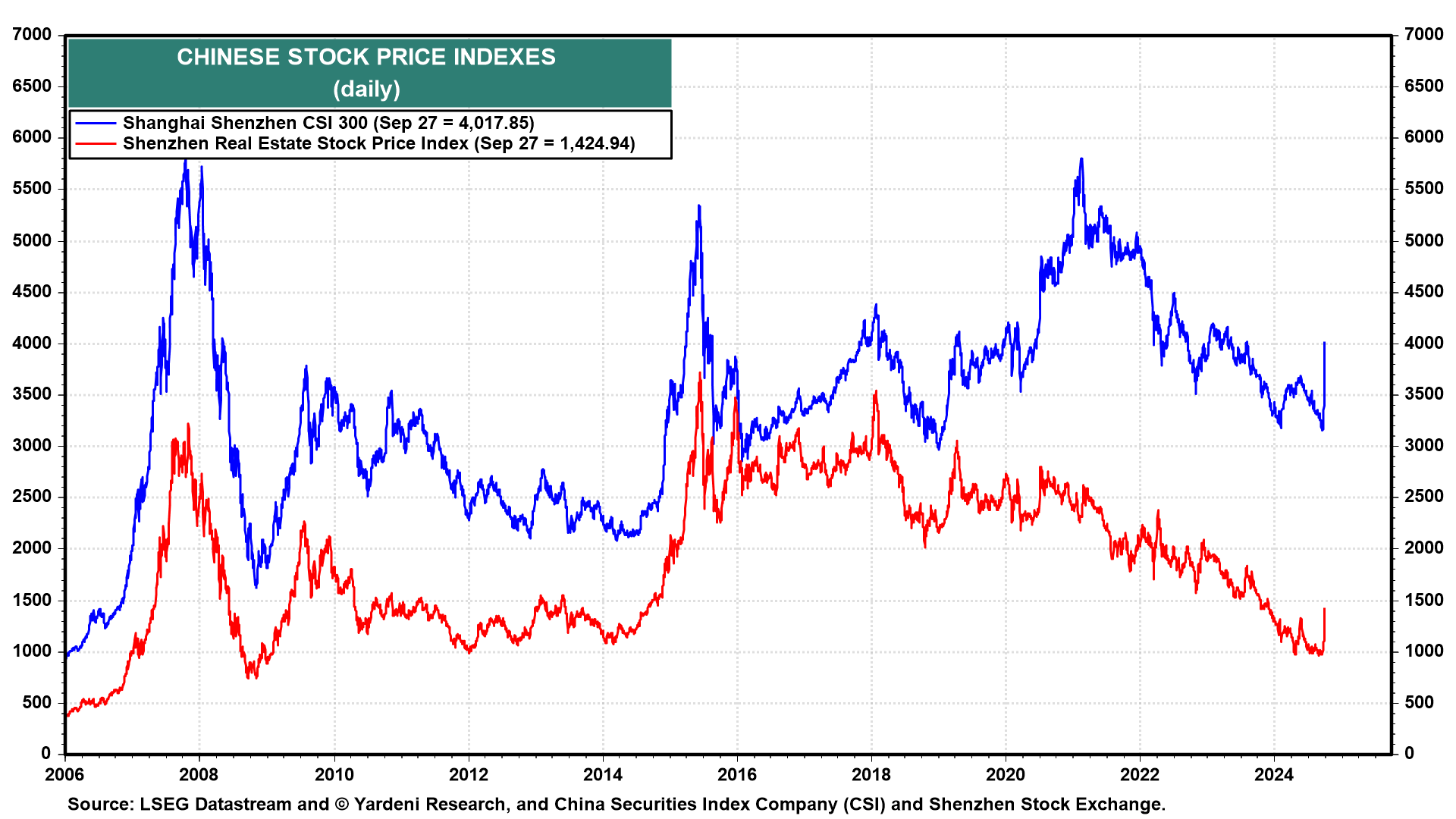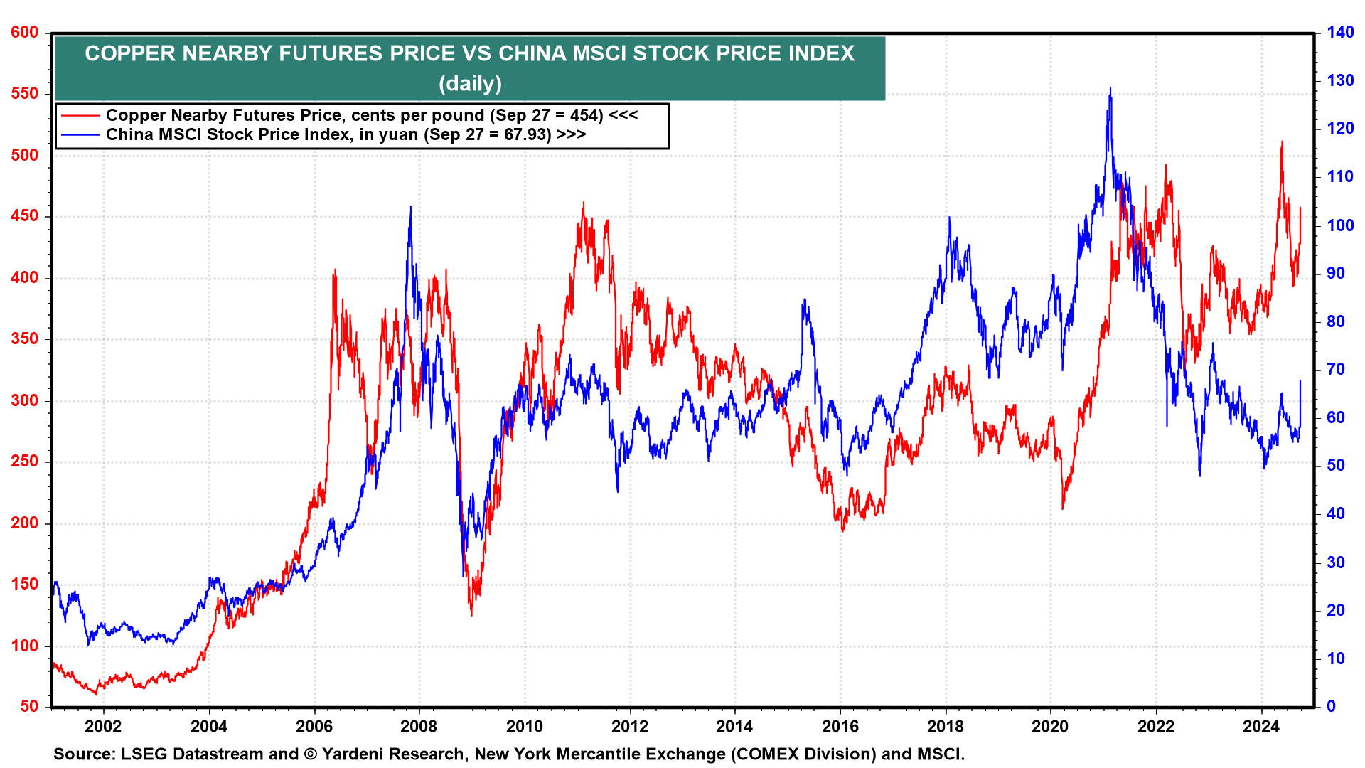 Time will tell if these twin bazookas shoot the silver bullets needed to revive China's weak consumer demand and ailing property rubble. Speaking of silver bullets, it's the copper bullet that will likely signal how well the economy is taking to the stimulus. The nearby copper futures price is up 11% over the past month but fell by 1.3% today. Copper is highly correlated with the Chinese economy and stock market (chart).