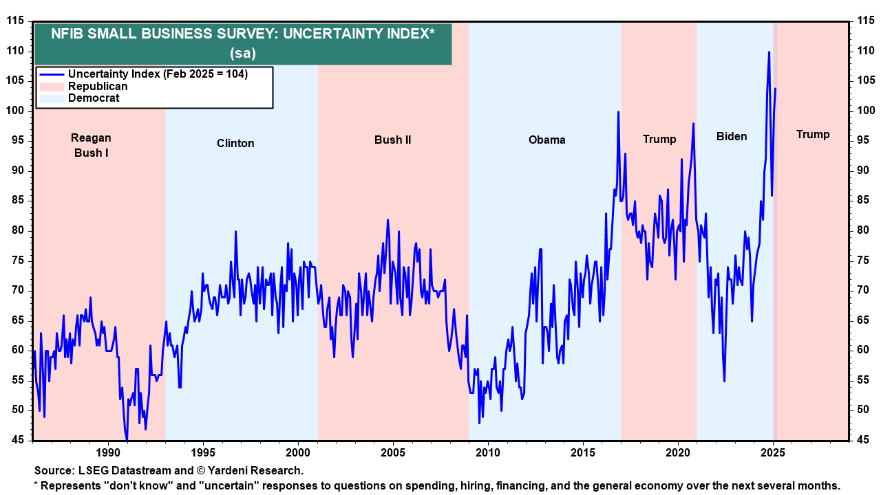 Investors are worrying about the adverse macroeconomic consequences of all this geopolitical turmoil. The uncertainty associated with rapid-fire tariff announcements from the White House could weigh on the economy. The NFIB survey of small business owners includes an uncertainty index, which rose to a new record high of 110 during October (chart). After the November 5 elections, it fell down to 86 in December and then rebounded to 104 in February.