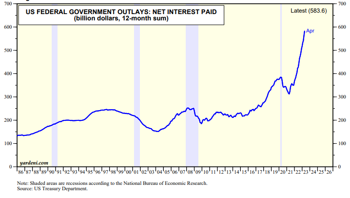 This doesn't mean that the Treasury will have no choice but to default on the government's debt as widely feared. Over the past 12 months through April, the US federal government's outlays on net interest paid rose to a record $583.6 billion (chart).