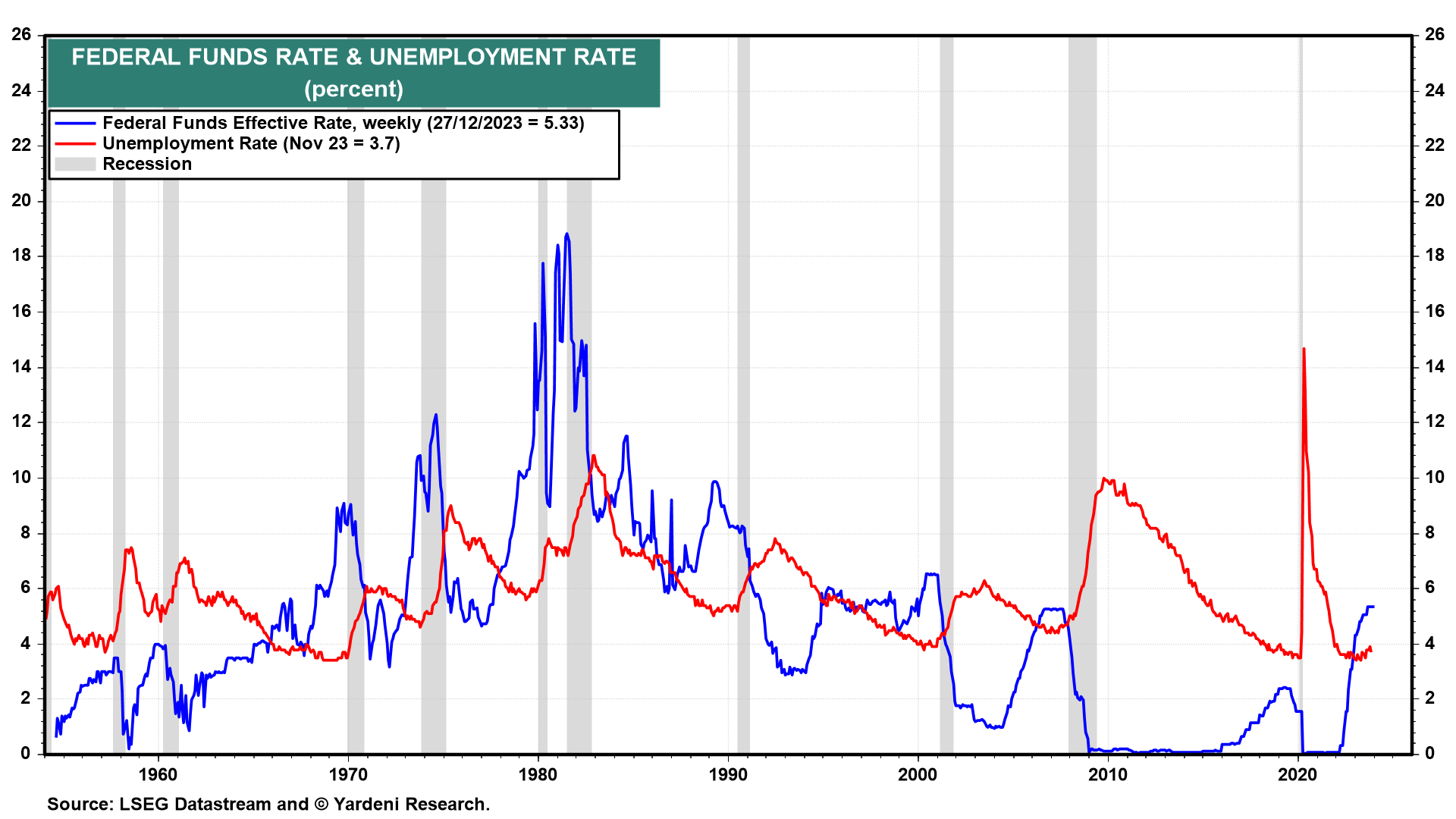 The stock and bond rallies since late October might have discounted an easier monetary policy this year than Fed officials are likely to deliver. That’s even if the inflation rate drops down to their 2.0% target ahead of schedule (Fig. 4). They will continue to be data dependent. As long as the unemployment rate remains below 4.0%, they are likely to hold off on easing, in our opinion. That’s because their worst nightmare would be a rebound in inflation.