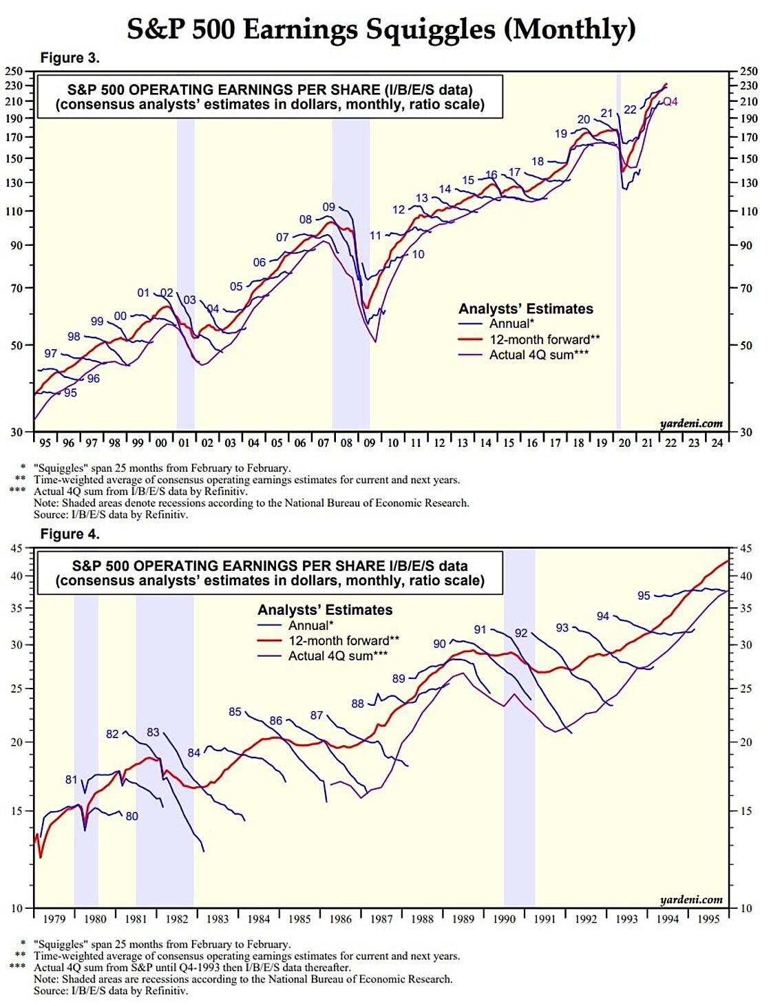 It’s widely recognized that the risks of a recession are rising. Yet there’s no sign that industry analysts’ estimates are reflecting that concern. In fact, the data show that analysts don’t anticipate recessions. They chop their estimates only when a recession becomes widely recognized. They are, however, very good at predicting earnings when the economy is growing. Here are a few more insights from the charts below: